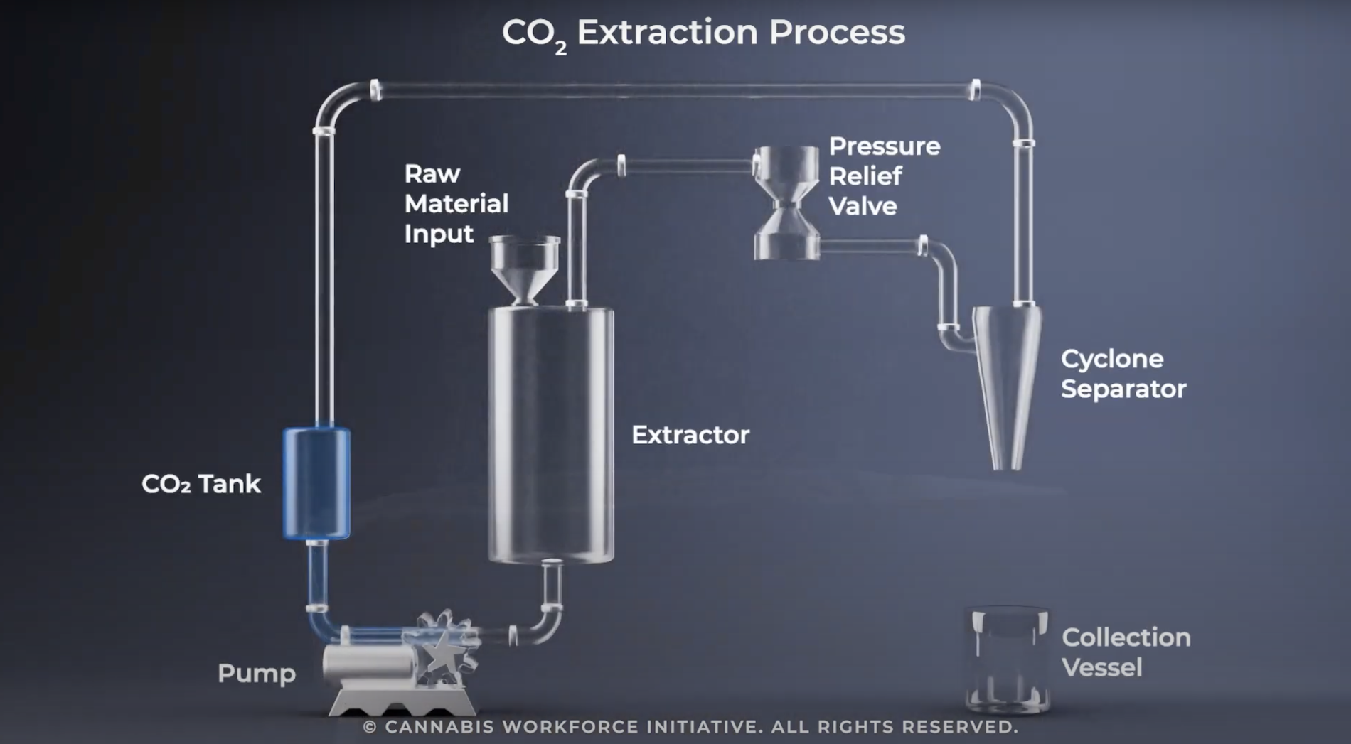 In an extractor, liquid CO2 enters via a pressurized pump, becoming supercritical due to pressure and temperature. This fog envelops the trichomes and compounds.